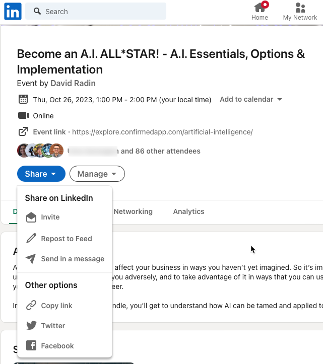 - Find the event on Linked; then click on the [Share] button. This pops up various options. You can do any one or all of them. For instance,