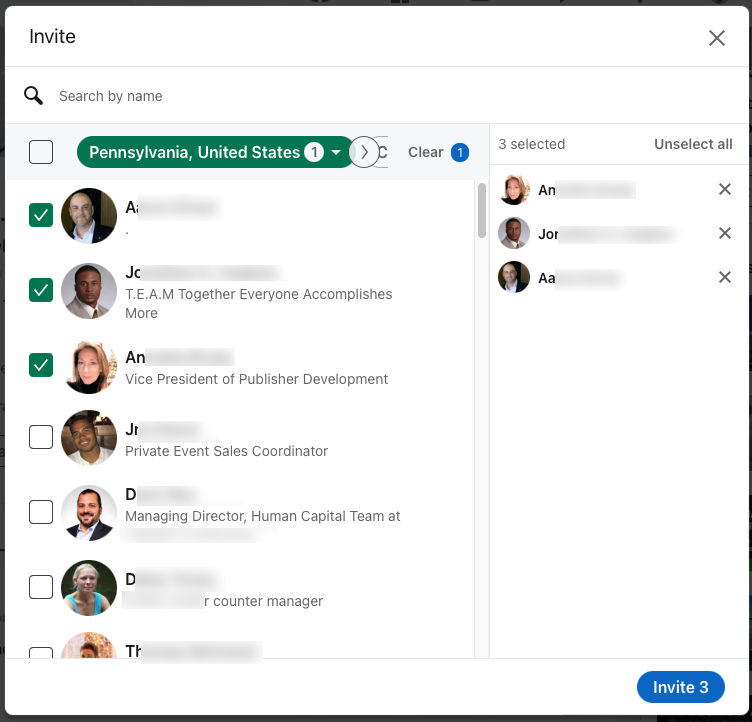 When you’re sharing with a lot of people via “Invite”, you’ll can send to everybody in your first degree LinkedIn network or narrow it by state, company, school or industry. Or you can search to find specific people.