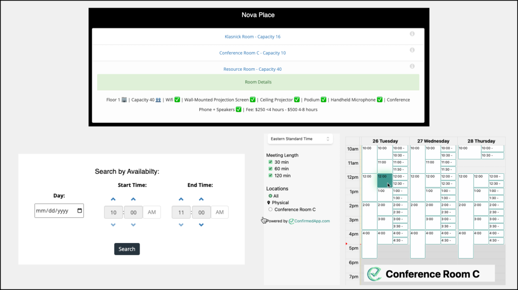 - Advanced room management features allow people to book your facilities based on their needs — search across rooms for specific times, learn how rooms are quipped.